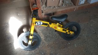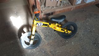 Bicicleta de equilibrio de color amarillo brillante, ideal para que los más pequeños aprendan a mantener el equilibrio. - Diseño deportivo con detalles en negro. - Ruedas negras. - Asiento negro. - Número 12 decorativo en el lateral.