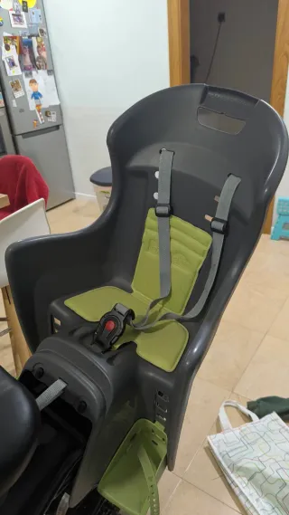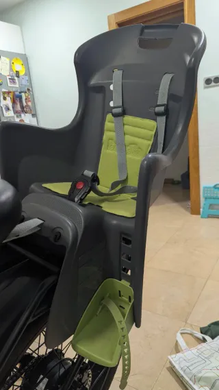 Silla para bicicleta infantil de la marca Polisport. Diseñada para el transporte seguro de niños. - Asiento acolchado en color verde. - Arnés de seguridad de 3 puntos. - Reposapiés ajustables.
