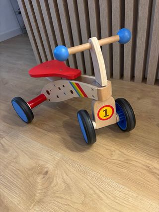 Triciclo de madera con diseño divertido y ruedas de goma. - Asiento rojo. - Ruedas negras con borde azul. - Detalles de arcoíris y número 1.