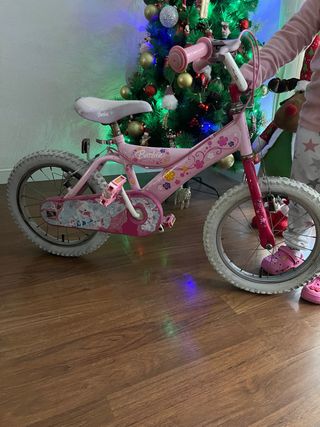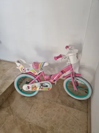 Bicicleta infantil de color rosa, ideal para los más pequeños. Cuenta con un asiento trasero para llevar a un acompañante. - Ruedas 14 pulgadas blancas con aro rosa. Para niñas de 3 a 6 años - Manillar blanco con puños rosas. - Sillín blanco. - Portabebés rosa. Bastante usada pero de pintura perfecta lo único es el cubrecadenas que está algo rayado. Se encuentra en puerto de Mazarrón