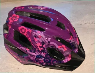 Casco de bicicleta con un divertido diseño floral en tonos morados y rosas. Ideal para protegerse mientras se monta en bici. - Diseño con flores y remolinos. - Color morado brillante. - Acolchado interior.