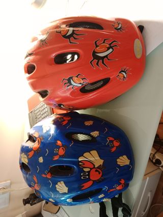 Set de dos cascos de bicicleta para niños en color rojo y colores, se venden juntos o por separado - Diseño infantil. - Marca: OXO Kid Edition. - Cierre ajustable.
