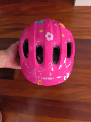 Casco de protección para niña de la marca ABUS, ideal para bicicleta o patinete. - Color rosa vibrante. - Diseño con flores y corazones. - Marca ABUS.