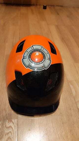Casco de bicicleta para niños en color naranja y negro hasta 10 años 52-56cm Casco infantil (52–56 cm) con espuma EPS, ventilación y ajuste preciso. Ligero y seguro, cumple con la norma EN 1078. Muy poco uso, no tiene golpes ni caidas. - Diseño con ventilación. - Correa ajustable para un ajuste seguro. - Adorno decorativo en la parte superior.