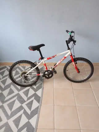 Bicicleta blanca y roja para niños, ideal para edades entre 7 y 10 años. - Marca Decathlon. - Diseño BMX. - Ruedas de 20 pulgadas.