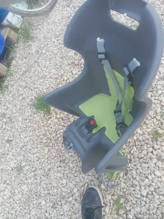 Silla de seguridad para transportar niños en bicicleta. Fabricada en plástico resistente y con arneses de sujeción. - Color gris y verde. - Cinturón de seguridad de 3 puntos. - Reposapiés ajustables.