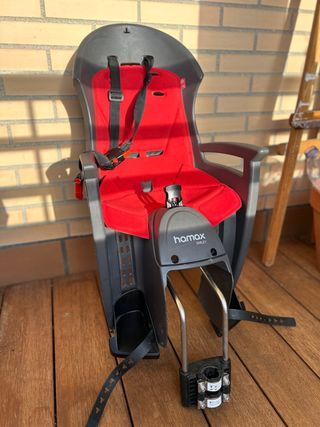 Asiento para transportar niños en bicicleta. Diseñado para la seguridad y comodidad del pequeño. - Color negro y rojo. - Arnés de seguridad de 3 puntos. - Reposapiés ajustables.