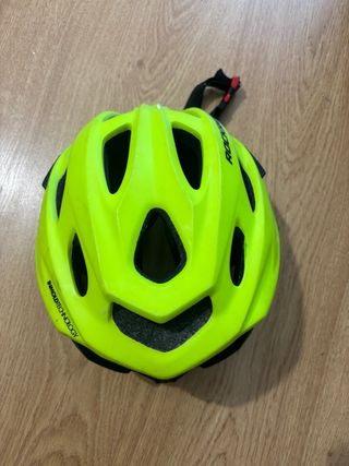 Casco de bicicleta de color amarillo brillante, ideal para niños. Cuenta con un diseño ventilado y correas ajustables para mayor seguridad. - Tecnología In-Mold. - Marca: ROCKRIDER.