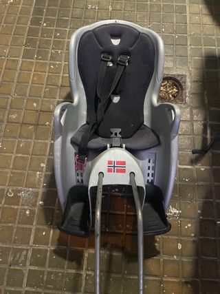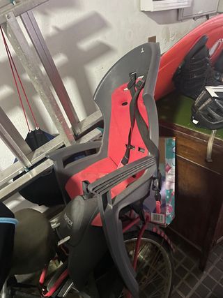 Silla para bicicleta infantil, usada pero en buen estado. Ideal para llevar a los más pequeños de forma segura y cómoda. - Incluye soporte de montaje. - Asiento acolchado rojo. - Estructura de plástico resistente.