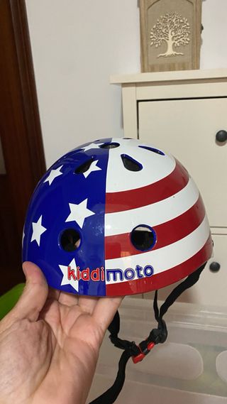 Casco de bicicleta Kiddimoto para niños, con diseño de bandera de Estados Unidos. Está en buen estado. - Diseño de bandera americana. - Marca Kiddimoto. - Talla para niños.
