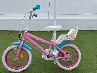 Bicicleta infantil de color rosa con diseño de Peppa Pig. Ideal para los más pequeños. - Asiento trasero para muñecos. - Ruedines de apoyo. - Cesta delantera - Diseño divertido con Peppa Pig y amigos.