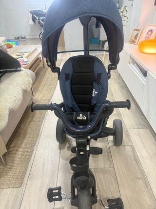 Triciclo infantil de color azul, ideal para paseos. - Asiento acolchado y reclinable por si se duerme - Capota protectora que también puede quitarse, para lavar o quitar - Reposapiés que se esconde en caso de no usarse - Cesta portaobjetos y dos portabotellas. - se puede quitar y poner la funcionalidad de los pedales y de la direccion del niño, es decir, tu puedes pasearlo, y el niñx “conducir” sin afectar a la direccion que escoja el adulto