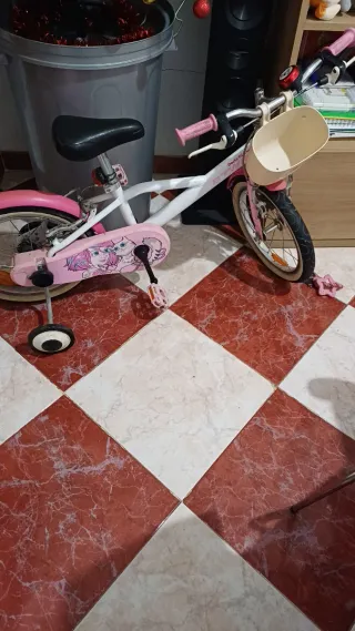 Bicicleta infantil en color blanco con detalles en rosa. Ideal para las pequeñas ciclistas. Prácticamente nueva, la hemos usado solo una vez porque le quedó pequeña. - Cuadro blanco. - Guardabarros y portabultos rosa. - Ruedines no incluidos.