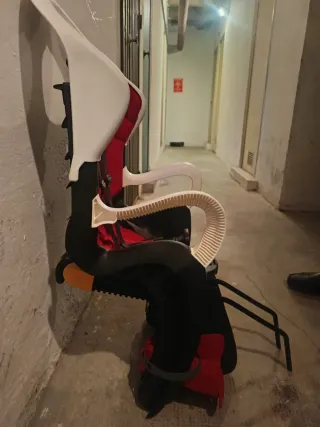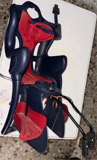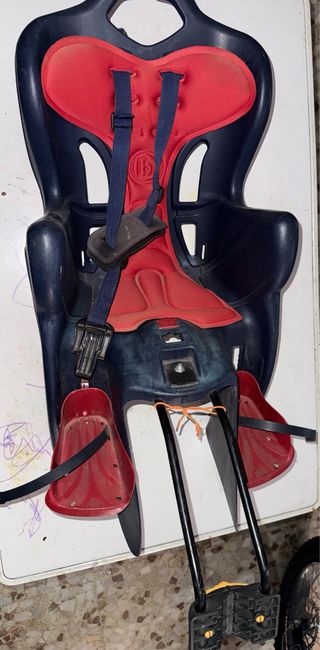 Sillita para transportar niños en bicicleta. Fabricada en plástico resistente y con acolchado rojo para mayor comodidad. - Arnés de seguridad de 3 puntos. - Reposapiés ajustables. - Diseño ergonómico.