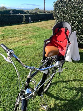Silla de seguridad para transportar niños en bicicleta. Diseñada para ofrecer comodidad y protección. - Asiento acolchado. - Reposapiés ajustables.