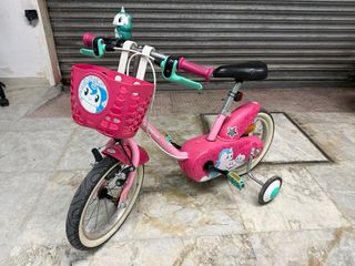 Bicicleta para niña en buen estado, ideal para aprender a pedalear. - Color rosa y blanco. - Ruedines incluidos. - Diseño con dibujos de gatitos y niñas.