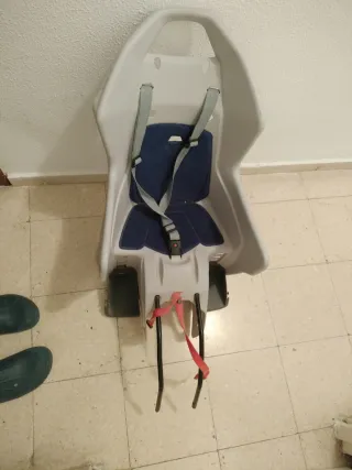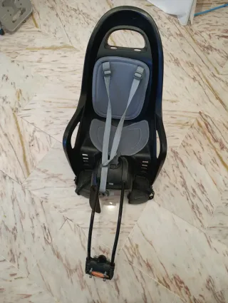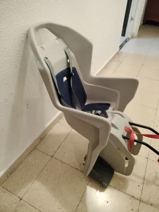 Sillita para transportar niños en bicicleta. Diseño ergonómico y seguro. - Asiento acolchado. - Arnés de seguridad de 3 puntos. - Reposapiés ajustables. - Estructura de plástico resistente.