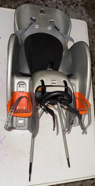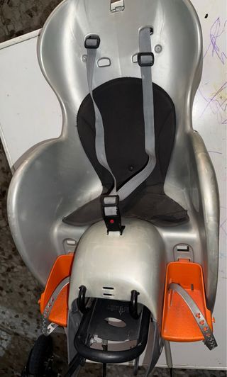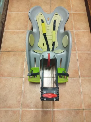 Silla para transportar niños en bicicleta. - Asiento de plástico gris y amarillo. - Cinturones de seguridad. - Reposapiés verdes ajustables.