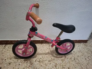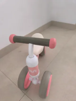 Bicicleta de equilibrio de color rosa y blanco, ideal para los más pequeños. - Diseño de tres ruedas para mayor estabilidad. - Asiento acolchado para mayor comodidad. - Manillar con empuñaduras suaves.
