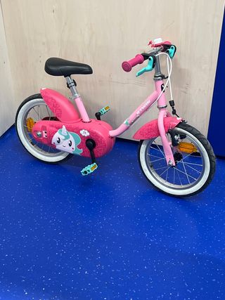 Bicicleta infantil rosa de Decathlon con diseño de unicornio. - Incluye ruedines para facilitar el aprendizaje. - Cesta delantera. - Decoración de unicornio en el cuadro y manillar.