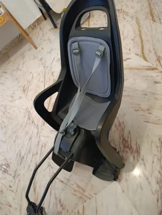 Silla para bicicleta marca Decathlon, ideal para transportar a los más pequeños de forma segura. - Asiento cómodo y ergonómico. - Arnés de seguridad ajustable. - Reposapiés. - Diseño en color gris y negro.
