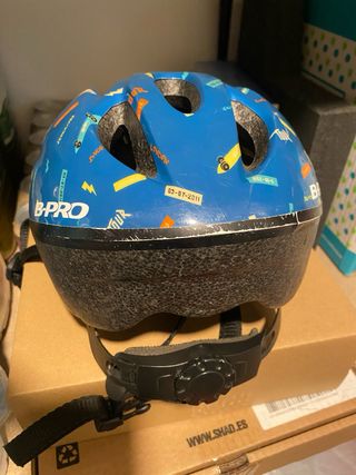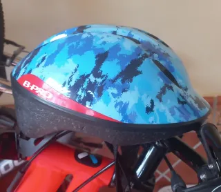 Casco de bicicleta para niños con un diseño llamativo. - Estampado camuflaje azul y negro. - Marca B-PRO. - Borde de seguridad rojo.
