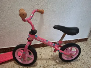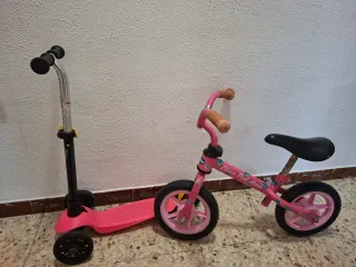 Se vende lote de patinete y bicicleta sin pedales para niños. - Patinete de tres ruedas en color rosa. - Bicicleta de equilibrio en color rosa.