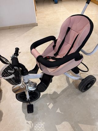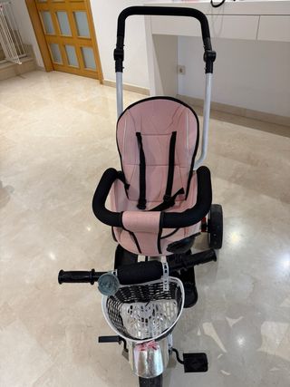 Triciclo infantil con un diseño moderno y cómodo para las pequeñas. - Asiento acolchado en color rosa. - Barra de empuje para adultos. - Cesta delantera para llevar objetos. Le falta bocina y la capota el techito. Lo demas anda perfecto y gira perfectamente