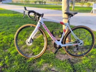 Vendo Pinarello Angliru Disk (Talla 52). Geometría Gran Fondo, comodísima y muy cuidada. Ideal para alturas entre 1,72m y 1,77m aprox. 🌟 El cuadro tiene garantía de por vida (entrego papeles). ⚠️ OJO: En las fotos lleva otra tija. Se entrega con tija MOST original. Grupo: Manetas y cambio Shimano 105 11v. Bielas Shimano de serie. Frenos: Disco hidráulicos Shimano 105. Ruedas: Fulcrum Racing 400 DB. Cubiertas: Vittoria Corsa Control (flanco marrón, casi nuevas). Sillín: Selle Italia SLR. Tija y Potencia: MOST (Pinarello). Incluyo: Pedales Look Keo y portabidón