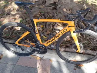 Bicicleta de carretera Pinarello de color naranja vibrante. Un diseño deportivo y aerodinámico. - Cuadro de carbono. - Frenos de disco. - Cambio Shimano. -full carbono Mejor ver en persona no tiene ni un solo arañazo se ha usado 2 veces contadas , único propietario.