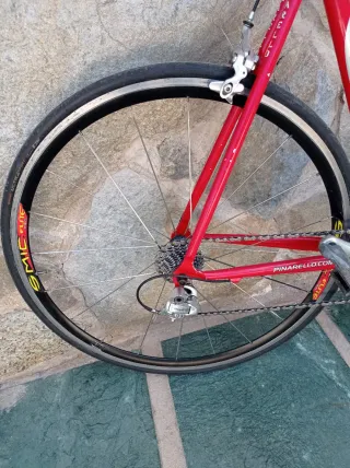 Bicicleta de carretera Pinarello Veneto, vintage de los años 80, roja con horquilla cromada, talla 55, perfecta. Con tubería Columbus Gara, aleación de acero con cromo y molibdeno. Equipada con Shimano 105, platos 52-42 y casette de 8 piñones (12-28), bielas de 170 mm y pedales Shimano con rastrales. Manillar Italmanubri (ITM) y potencia 3TTT. Sillín Selle Italia Xeno. Ruedas Mavic CXP14, de 30 mm de perfil, con los bujes Shimano. Cubiertas Continental Ultra Sport 700x25c. Todo original en perfecto estado. Lo único que está algo deteriorado son los vinilos con el logotipo de Pinarello, como se puede ver. Pesa 10'5 kg Eroica Reynolds