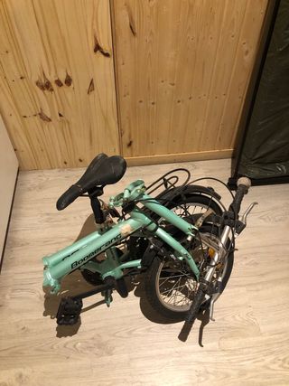 Bicicleta plegable de color verde menta, ideal para la ciudad. Es fácil de transportar y almacenar. - Marca: Boomerang - Modelo: 12.5d - Ruedas de 12.5 pulgadas