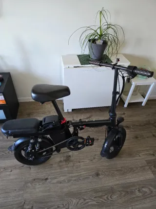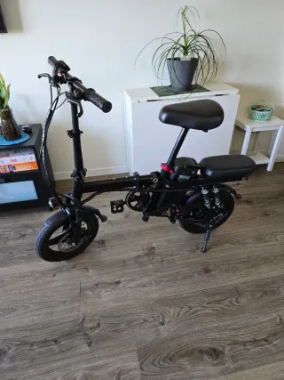 Bicicleta eléctrica plegable en excelente estado, potente, cómoda y resistente. Ideal para ciudad, desplazamientos diarios o reparto. • Motor: 250W (48V) • Batería: Litio 48V – 15Ah • Autonomía: hasta 45 km (según peso, terreno y uso) • Velocidad máxima: aprox. 32 km/h • Ruedas: 14 pulgadas, neumáticos vacuum • Carga máxima: 120 kg • Pendiente máxima: hasta 15° • Estructura: acero de alto carbono • Peso: aprox. 26,8 kg • Plegable: fácil de guardar y transportar Características: • Frenos de disco dobles (delantero y trasero) • Luz delantera • Pantalla de batería • Asiento doble cómodo • Portaequipajes trasero • Modo asistencia al p