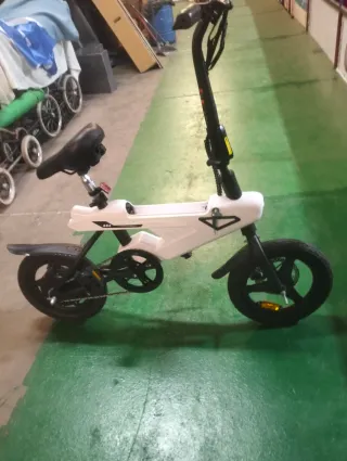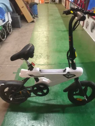 Bicicleta eléctrica plegable en color blanco. - Diseño compacto y fácil de transportar. - Ruedas de 14 pulgadas. - Frenos de disco. - Sillín ajustable. La bici está en muy bien estado La batería está bloqueada por pasar tiempo parada.