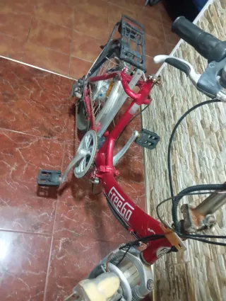 Bicicleta plegable de color rojo. A recoger. - Cuadro de metal resistente. - Ruedas de 20 pulgadas. - Sillín ajustable. - Portabultos trasero. Lleva tiempo guardada, por lo que necesita lavado de cara pero está en buenas condiciones.