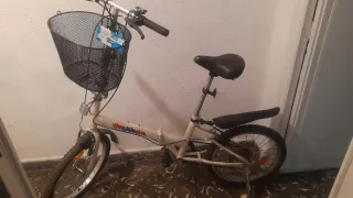Bicicleta plegable de color plateado, ideal para transportarla y guardarla fácilmente. - Ruedas de 20 pulgadas. - Sillín ajustable. - Manillar plegable. nesecita engrasarla ruedas pinchadas o vacía,caja de pedales descuadrada