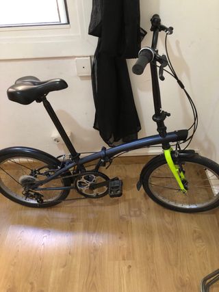 Bicicleta plegable Btwin en color azul con detalles en verde. - Cuadro plegable. - Ruedas de 20 pulgadas. - Cambio de marchas. - Guardabarros delantero y trasero. Falta una puesta apunto