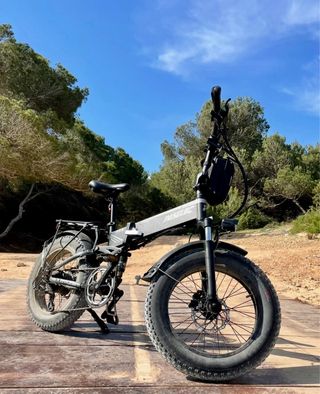 Bicicleta eléctrica plegable de color negro. Ideal para desplazamientos urbanos y fácil de almacenar. - Diseño plegable. - Ruedas de 20 pulgadas. - Portaequipajes trasero. - Luz trasera. La distancia máxima 20 km, km hecho 431 nada más ya que no se ha usado apenas la bici