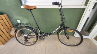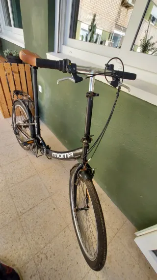 Bicicleta plegable MOMA Bike color negro. Esta casi sin usar. Tiene el reflectante trasero roto por el transporte. - Cuadro de aluminio. - Ruedas de 24 pulgadas. - Frenos V-Brake. - Cambio Shimano de 6 velocidades.