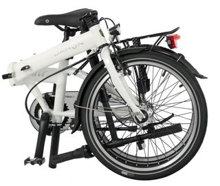 Bicicleta plegable Dahon Vybe D7 en color blanco. Ideal para desplazamientos urbanos y fácil de guardar. - Cuadro de aluminio. - Ruedas de 20 pulgadas. - Cambio de 7 velocidades. - Guardabarros delantero y trasero. - Portabultos trasero.