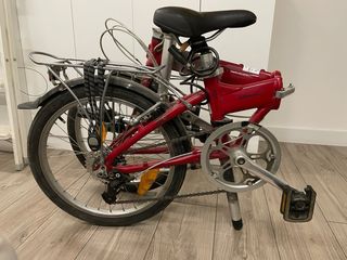 Bicicleta plegable DAHON ECO C7 en color rojo. - Cuadro de aluminio. - Ruedas de 20 pulgadas. - Portabultos trasero con pulpo. - Guardabarros. - Pata de cabra. - Luces delantera y trasera. recientemente revisada.