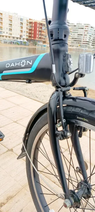 Bicicleta urbana plegable de la marca DAHON. - Color negro con detalles en azul. - Ruedas de tamaño reducido. - Sillín ajustable. - Guardabarros delantero y trasero. - Portaequipajes trasero. Mi mujer la uso unos meses, y tras caída le pillo miedo y lleva 3 años en el trastero.