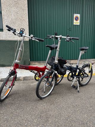 Se venden dos bicicletas plegables de la marca DAHON. Son ideales para desplazamientos urbanos y fáciles de guardar. - Color rojo y azul. - Ruedas pequeñas para mayor portabilidad. - Manillar y sillín ajustables. El precio es por unidad