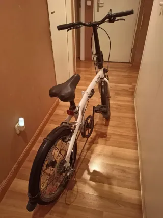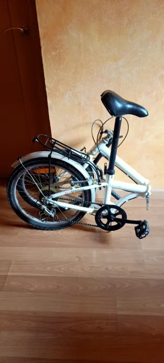 Bicicleta plegable de color blanco, ideal para desplazamientos urbanos. - Cuadro de metal. - Ruedas con radios. - Guardabarros delantero y trasero. El sillin esta un poco doblado, pero se puede usar igualmente. Necesita mantenimiento Pesa aproximadamente unos 14,500 kilos con sillin.