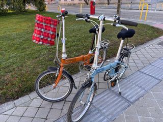 Se venden dos bicicletas plegables de la marca Dahon, una en color naranja y otra en azul. Son perfectas para desplazamientos urbanos y fáciles de guardar. - Bicicleta plegable Dahon naranja. - Bicicleta plegable Dahon azul. - Asientos negros. - Pedales plegables. - funda de transporte Dahon - Cesta delantera