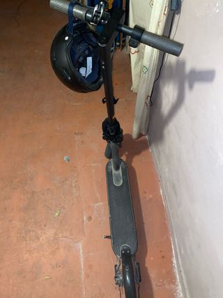 Patinete eléctrico en color negro, ideal para desplazamientos urbanos. Incluye casco. - Diseño plegable para facilitar su transporte. - Ruedas resistentes para un paseo suave. -cargador,candado incluido y casco