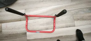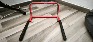 Soporte plegable de color rojo para bicicletas. Fácil de guardar y transportar. - Estructura metálica. - Mangos de goma negra para un mejor agarre.
