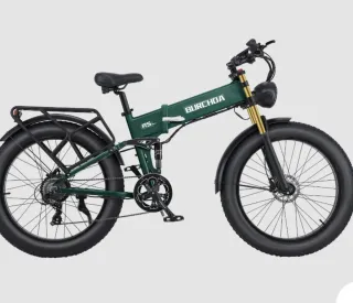 Bicicleta eléctrica plegable de la marca Burchda, modelo 5PRO. Color verde oscuro. - Diseño plegable para fácil transporte y almacenamiento. - Ruedas anchas tipo fat bike. - Portaequipajes trasero integrado. - Horquilla delantera dorada. - Faro delantero redondo. Se regala casco guantes bomba sujeción para el móvil y pitón. 607339749