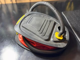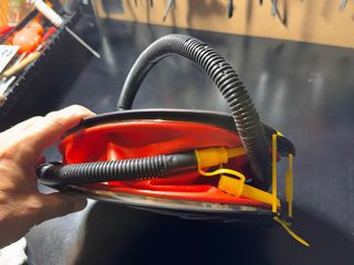 Inflador de pie Mondo con manguera y bolsa de aire. - Diseño plegable. - Color negro y amarillo con detalles rojos.