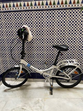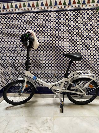 Bicicleta plegable B'Twin Tilt (Decathlon), ideal para desplazamientos urbanos y fácil de almacenar. - Cuadro de aluminio. - Ruedas de 20 pulgadas. - Frenos V-brake. - Sillín ajustable en altura. Esta usada, pero en buen estado, aunque convendría engrasarla.